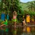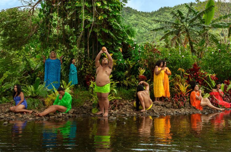 Paradise Camp responds to famous paintings of Tahiti and its people by French modernist artist Paul Gauguin (1848-1903). Through archival research, Kihara links Gauguin’s paintings to colonial photographs taken in Sāmoa. Described by Kihara as an act of ‘upcycling’, she recreates Gauguin’s compositions in a series of 12 resplendent high definition photographs, shot on location in Upolu Island. Collaborating with Fa’afafine models and production crew, Kihara repurposes these cultural artefacts to speak to, and from, queer Indigenous worlds in a profound gesture of reclamation.
